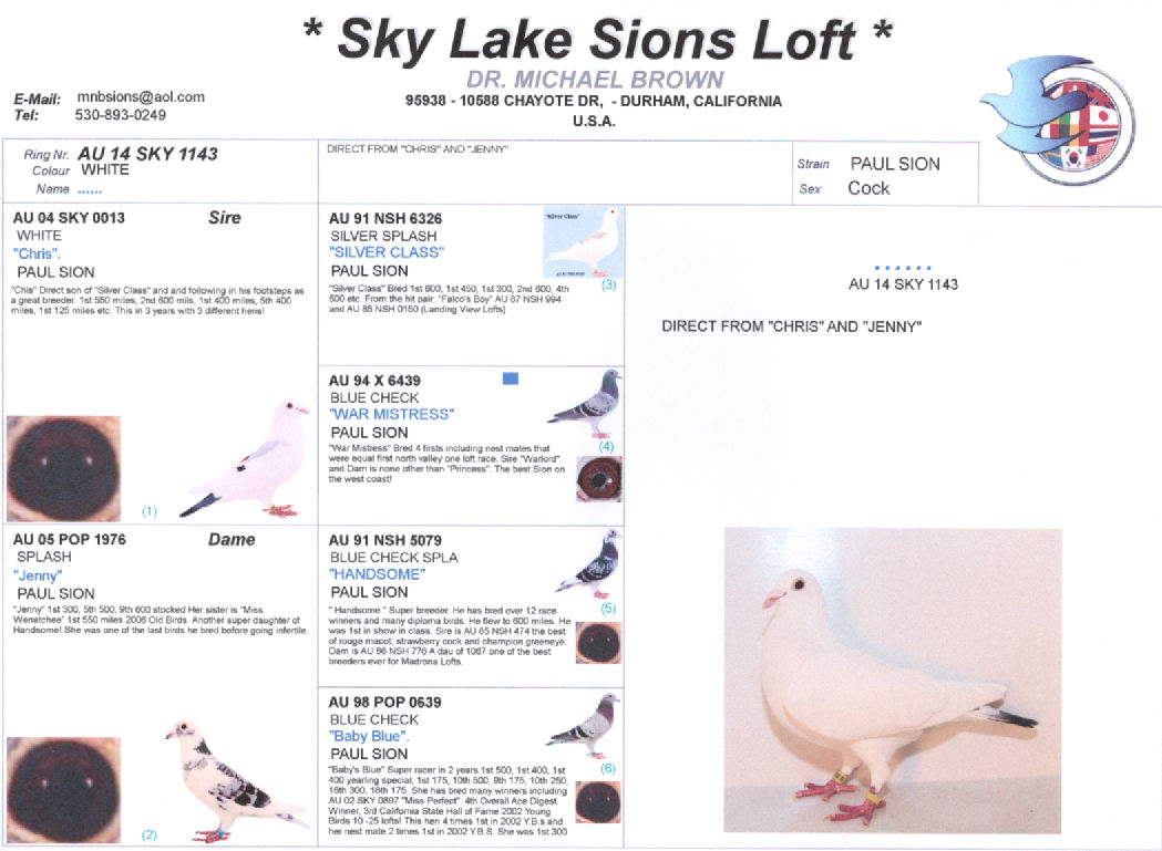 Sire: "Chis" Direct son of "Silver Class" and and following in his footsteps as a great breeder. 1st 550 miles, 2nd 600 mils, 1st 400 miles, 5th 400 miles, 1st 125 miles etc. This in 3 years with 3 different hens! Sire "Silver Class" Outstanding breeding cock At last count he had bred 1st 600, 1st 450, 1st 300, 2nd 600, 4th 500 etc. From the hit pair: "Falco's Boy" AU 87 NSH 994 and AU 85 NSH 0150 (Landing View Lofts). Dam (the last ever bred from her!) is AU 04 X 6439 "War Mistress" Bred 4 firsts including nest mates that were equal first north valley one loft race. Sire "Warlord" and Dam is none other than "Princess". The best Sion on the west coast!